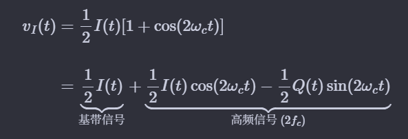 & =\underbrace{\frac{1}{2}I(t)}{\text{基带信号}}+\underbrace{\frac{1}{2}I(t)\cos(2\omega_ct)-\frac{1}{2}Q(t)\sin(2\omega_ct)}{\text{高频信号 }(2f_c)}