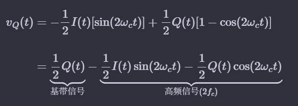 & =\underbrace{\frac{1}{2}Q(t)}{基带信号}-\underbrace{\frac{1}{2}I(t)\sin(2\omega_ct)-\frac12Q(t)\cos(2\omega_ct)}{\text{高频信号}(2f_c)}