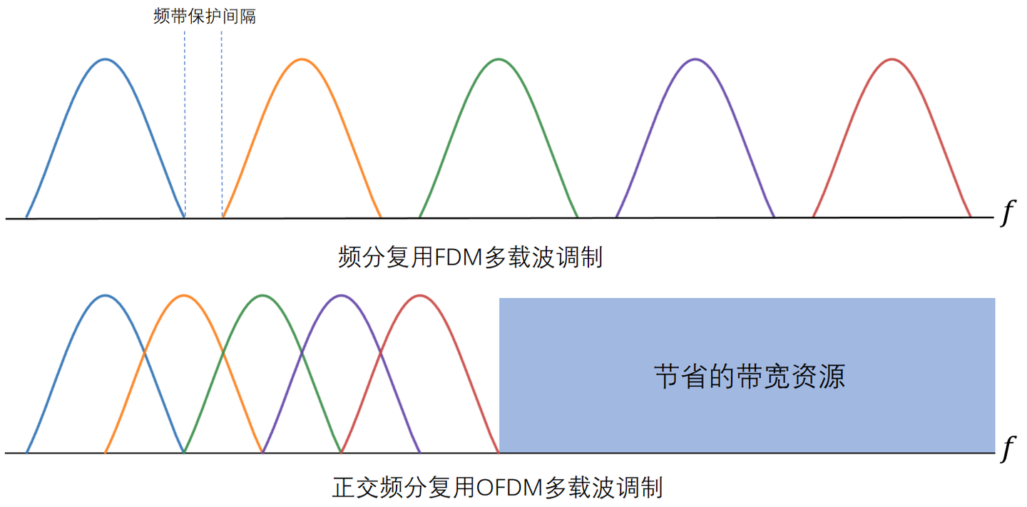 FDM 每个子载波都需要单独调制解调,系统复杂度高,并且由于频带保护间隔的存在,频谱效率较低。而 OFDM 的子载波频谱之间允许部分重叠,子载波信号依然保有正交性,节省传输带宽,并且 OFDM 只需进行一次调制解调,复杂度低。